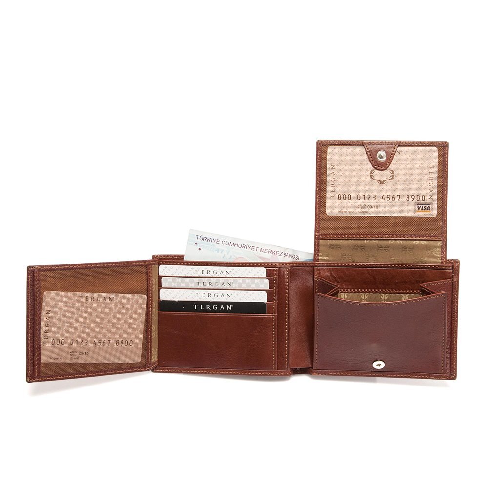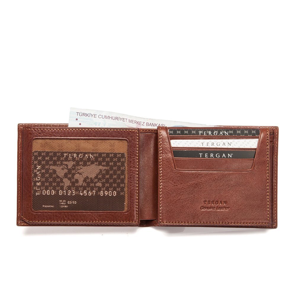Tergan deri cüzdan gerçek deriden üretilmiştir. Tergan deri cüzdanın kapalı ölçüsü Yükseklik 9,3 cm Genişlik 11,6 cm Kalınlık 2,5 cm. Tergan deri cüzdanın sekiz adet kart bölmesi kimlik bölmesi ve bozuk para bölmesi vardır.