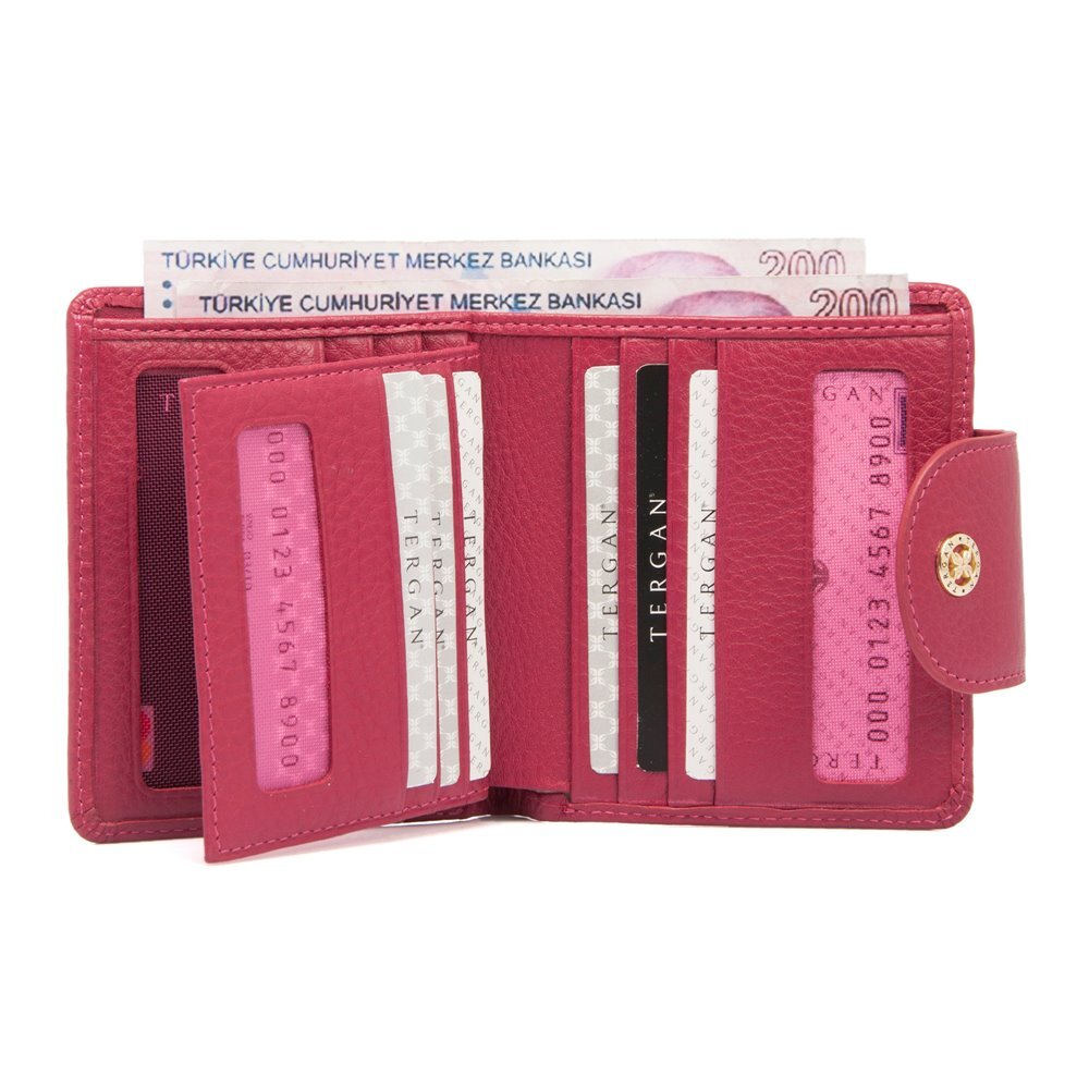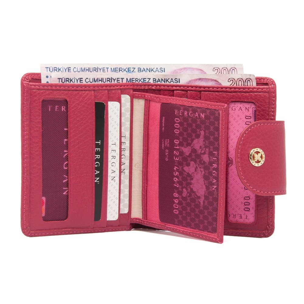 Gelince Haber VerKadın deri cüzdan gerçek deriden üretilmiştir. Tergan Kadın Deri Cüzdanın kapalı ölçüsü yükseklik 11,5 cm genişlik 9,5 cm kalınlık 2 cm. Kadın Cüzdan da dokuz adet kredi kart bölmesi, üç adet saklama alanı, ehliyet ve kimlik bölmesi ve arka kısmında çıtçıtlı bozuk para bölmersi vardır. Kadın cüzdanın kapama şekli çıtçıtlıdır.