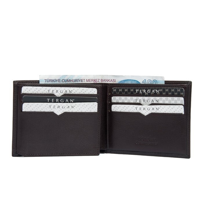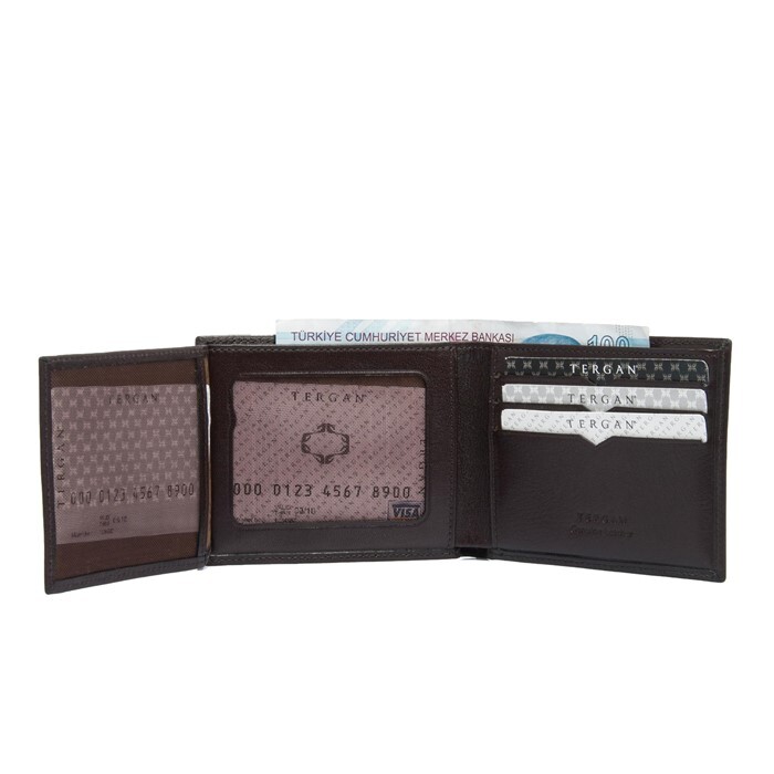Tergan deri cüzdan gerçek deriden üretilmiştir. Tergan deri cüzdanın kapalı ölçüsü Yükseklik 8,5 cm Genişlik 10,5 cm Kalınlık 2 cm. Tergan deri cüzdanın altı adet kart bölmesi, kimlik bölmesi ve iki adet para bölmesi vardır.