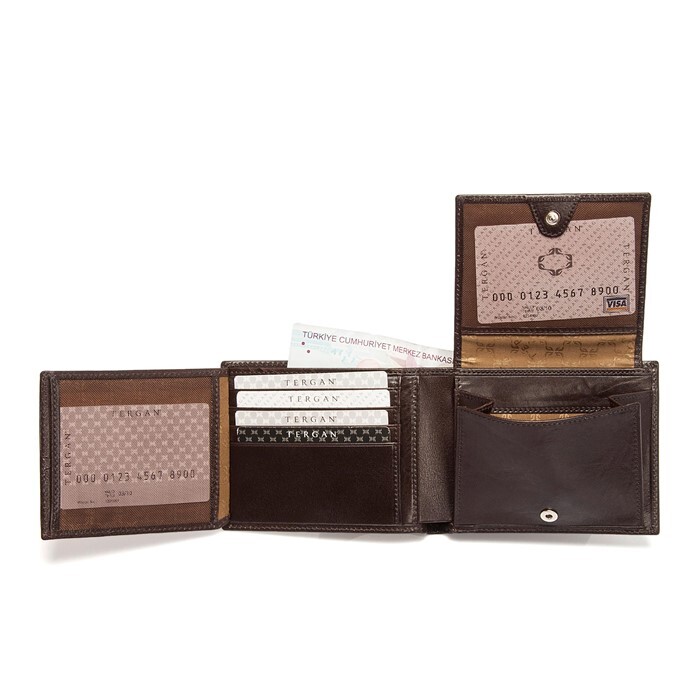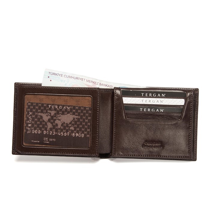Tergan deri cüzdan gerçek deriden üretilmiştir. Tergan deri cüzdanın kapalı ölçüsü Yükseklik 9,3 cm Genişlik 11,6 cm Kalınlık 2,5 cm. Tergan deri cüzdanın sekiz adet kart bölmesi kimlik bölmesi ve bozuk para bölmesi vardır.