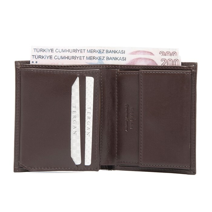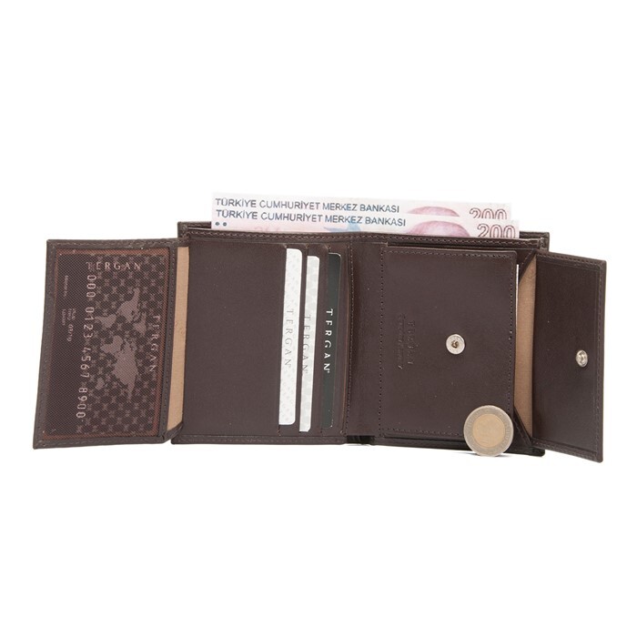 Tergan deri cüzdan gerçek deriden üretilmiştir. Tergan deri cüzdanın kapalı ölçüsü Yükseklik 10,6 cm Genişlik 9 cm Kalınlık 2,5 cm. Tergan deri cüzdanın beş adet kredi kart bölmesi, kimlik bölmesi ve bozuk para bölmesi vardır.