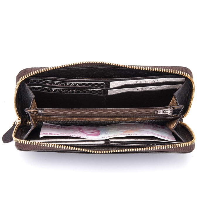 Kadın Deri Cüzdan gerçek deriden üretilmiştir. Kadın Cüzdanın kapalı ölçüsü Yükseklik 11 cm, Genişlik 19,5 cm, Kalınlık 3 cm. Tergan Kadın Cüzdan da sekiz adet kredi kart bölmesi, beş adet saklama alanı ve iç kısmında bir adet fermuarlı bölme vardır. Kadın cüzdanını el ile taşımak için sapı vardır.