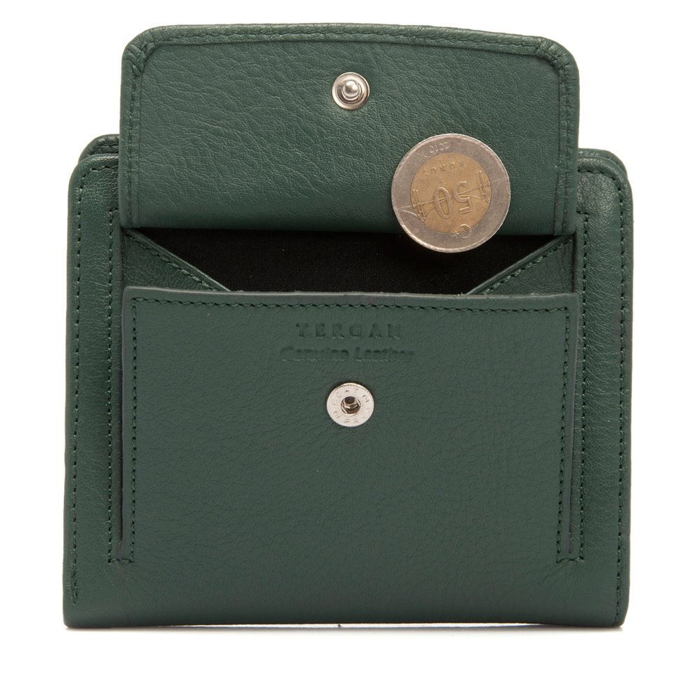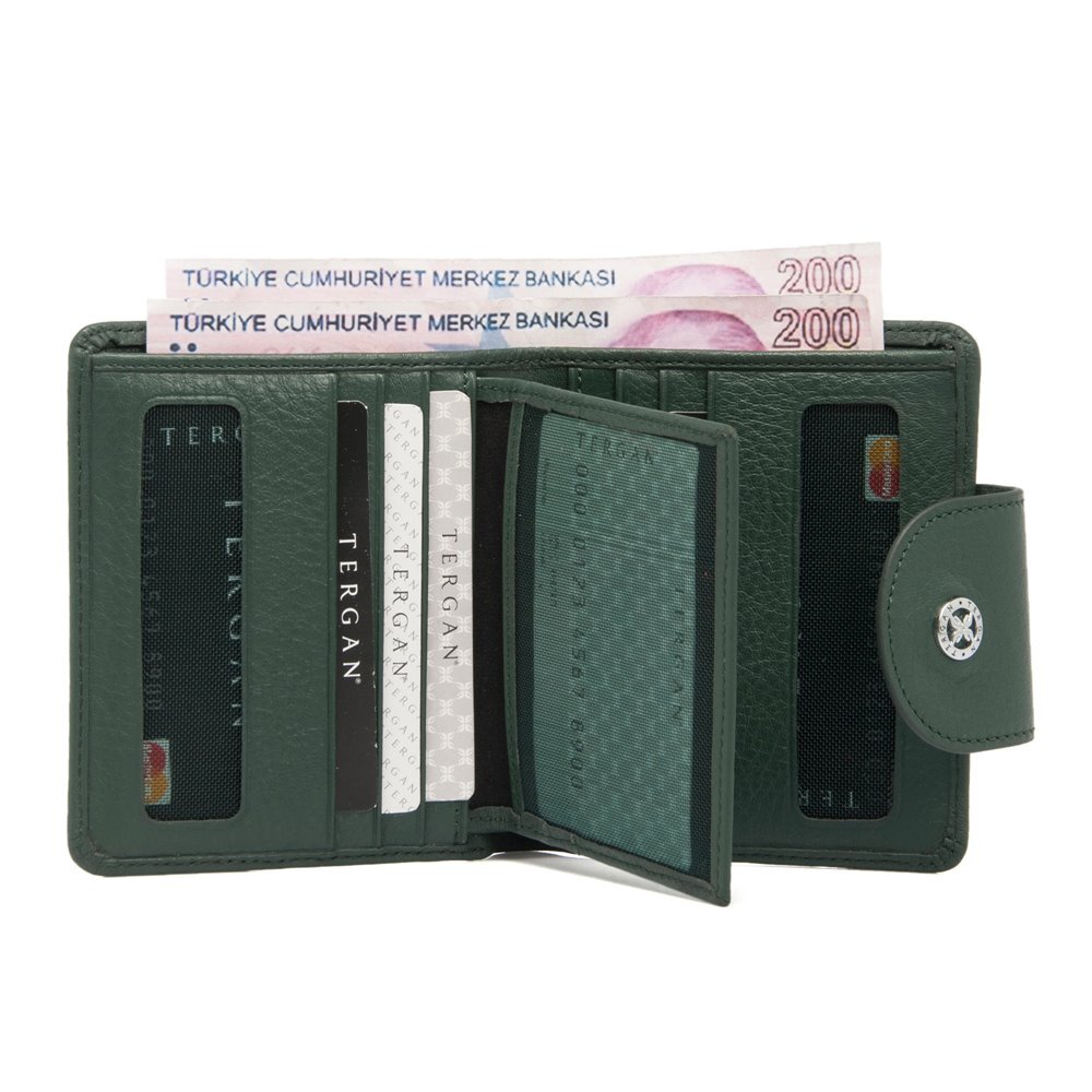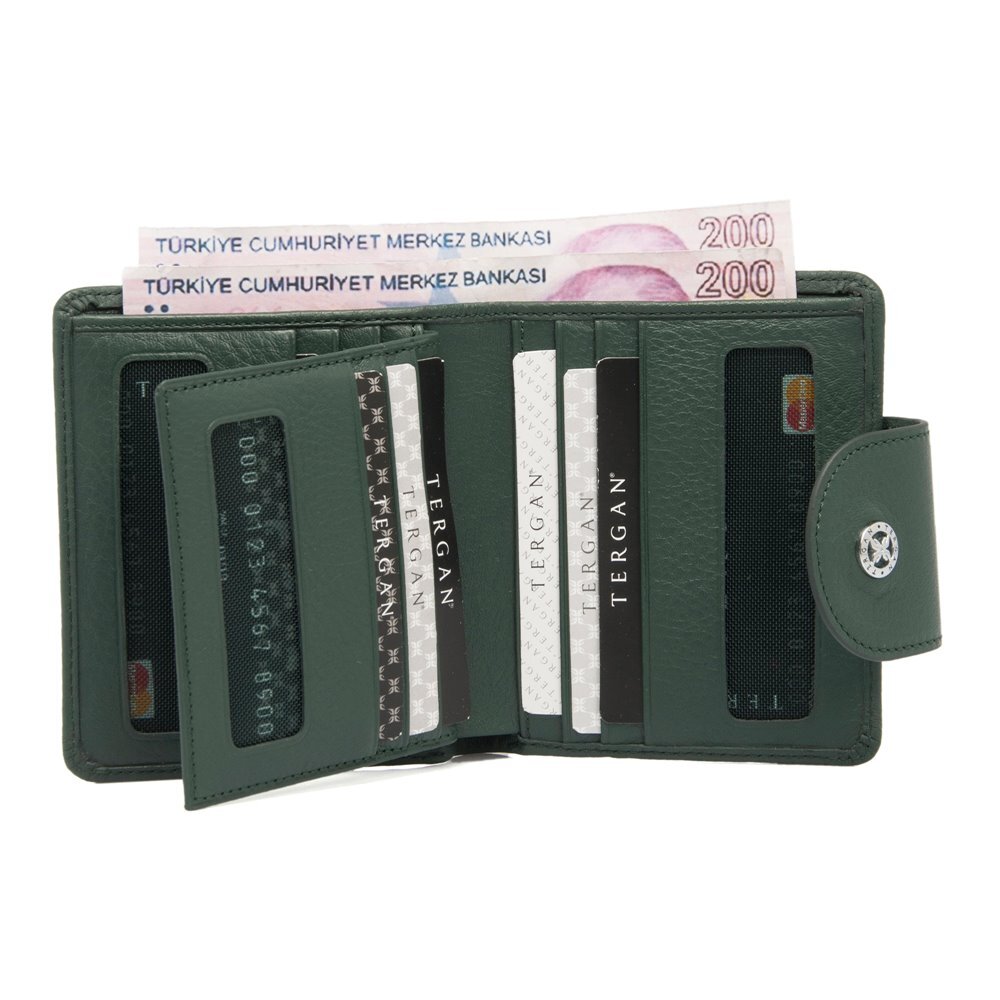 Gelince Haber VerKadın deri cüzdan gerçek deriden üretilmiştir. Tergan Kadın Deri Cüzdanın kapalı ölçüsü yükseklik 11,5 cm genişlik 9,5 cm kalınlık 2 cm. Kadın Cüzdan da dokuz adet kredi kart bölmesi, üç adet saklama alanı, ehliyet ve kimlik bölmesi ve arka kısmında çıtçıtlı bozuk para bölmersi vardır. Kadın cüzdanın kapama şekli çıtçıtlıdır.
