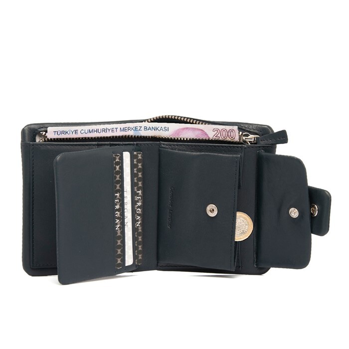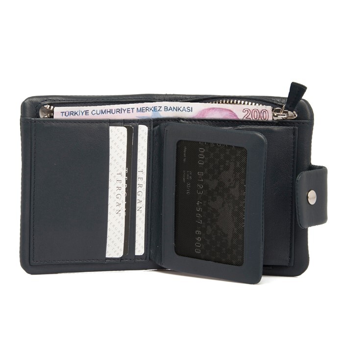 Tergan deri cüzdan gerçek deriden üretilmiştir. Tergan deri cüzdanın kapalı ölçüsü Yükseklik 11,5 cm Genişlik 9,5 cm Kalınlık 2 cm. Tergan deri cüzdanın altı adet kart bölmesi yeni kimlik bölmesi ve bozuk para bölmesi vardır. İki adet para bölmesinden birisi fermuarlı dır.