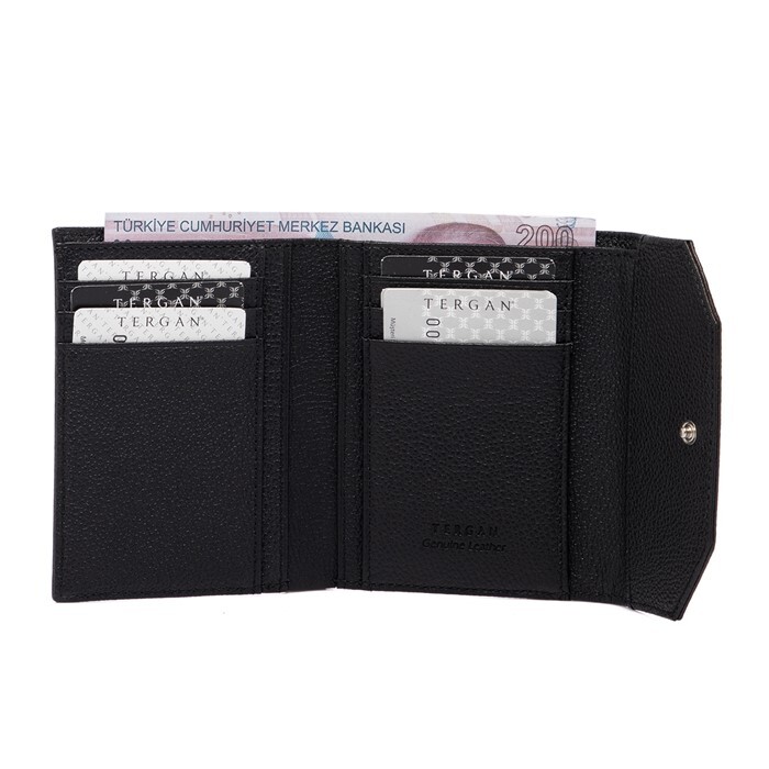 Kadın Deri Cüzdan gerçek deriden üretilmiştir. Kadın Deri Cüzdanın Kapalı ölçüsü Yükseklik 9,5 cm Genişlik 11,5 cm Kalınlık 2 cm. Tergan Kadın Cüzdan da altı adet kredi kart bölmesi, beş adet saklama alanıve arka kısmında fermuarlı bozuk para bölmesi vardır. Kadın cüzdanın kapama şekli çıtçıtlıdır.