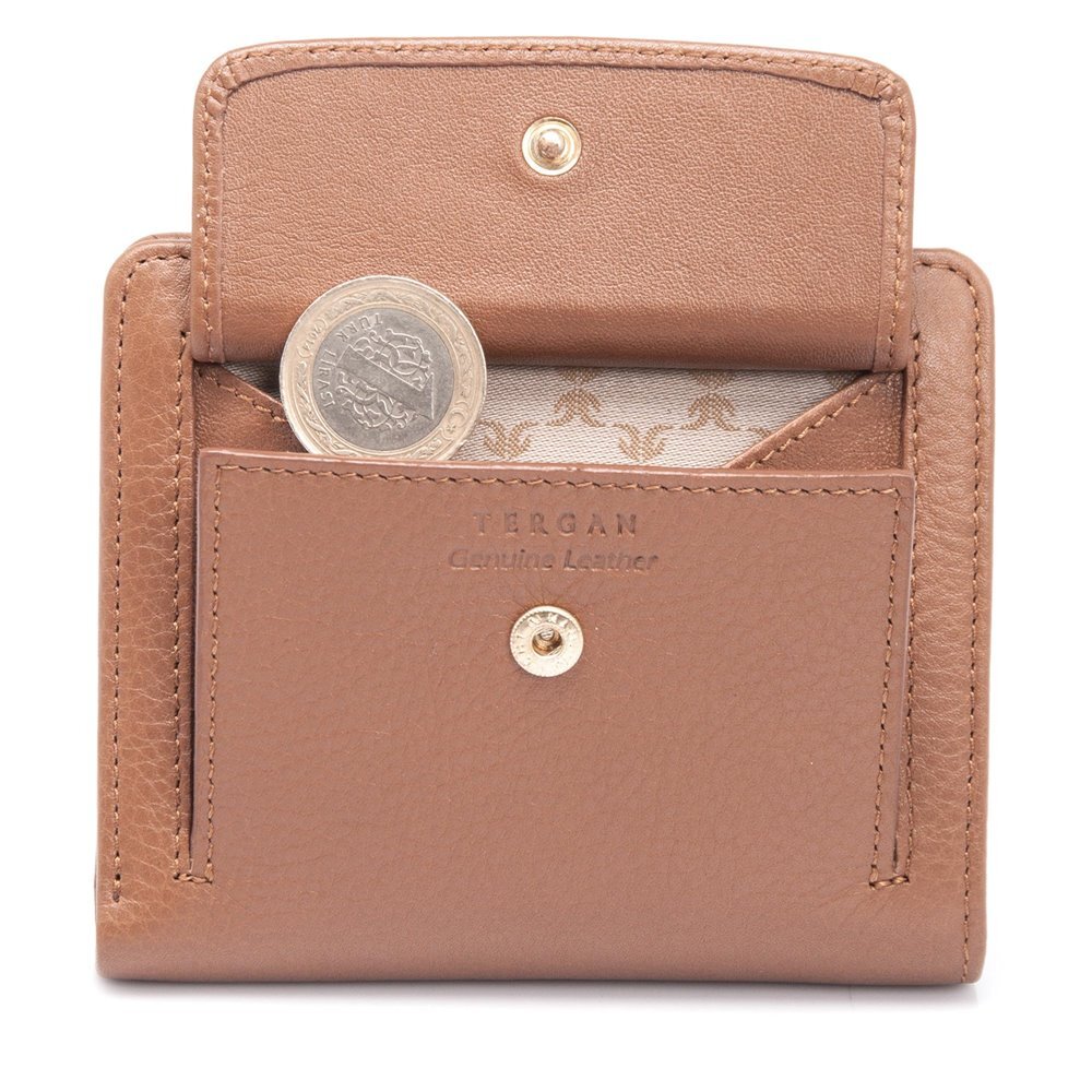 Kadın deri cüzdan gerçek deriden üretilmiştir. Tergan Kadın Deri Cüzdanın kapalı ölçüsü yükseklik 11,5 cm genişlik 9,5 cm kalınlık 2 cm. Kadın Cüzdan da dokuz adet kredi kart bölmesi, üç adet saklama alanı, ehliyet ve kimlik bölmesi ve arka kısmında çıtçıtlı bozuk para bölmersi vardır. Kadın cüzdanın kapama şekli çıtçıtlıdır.