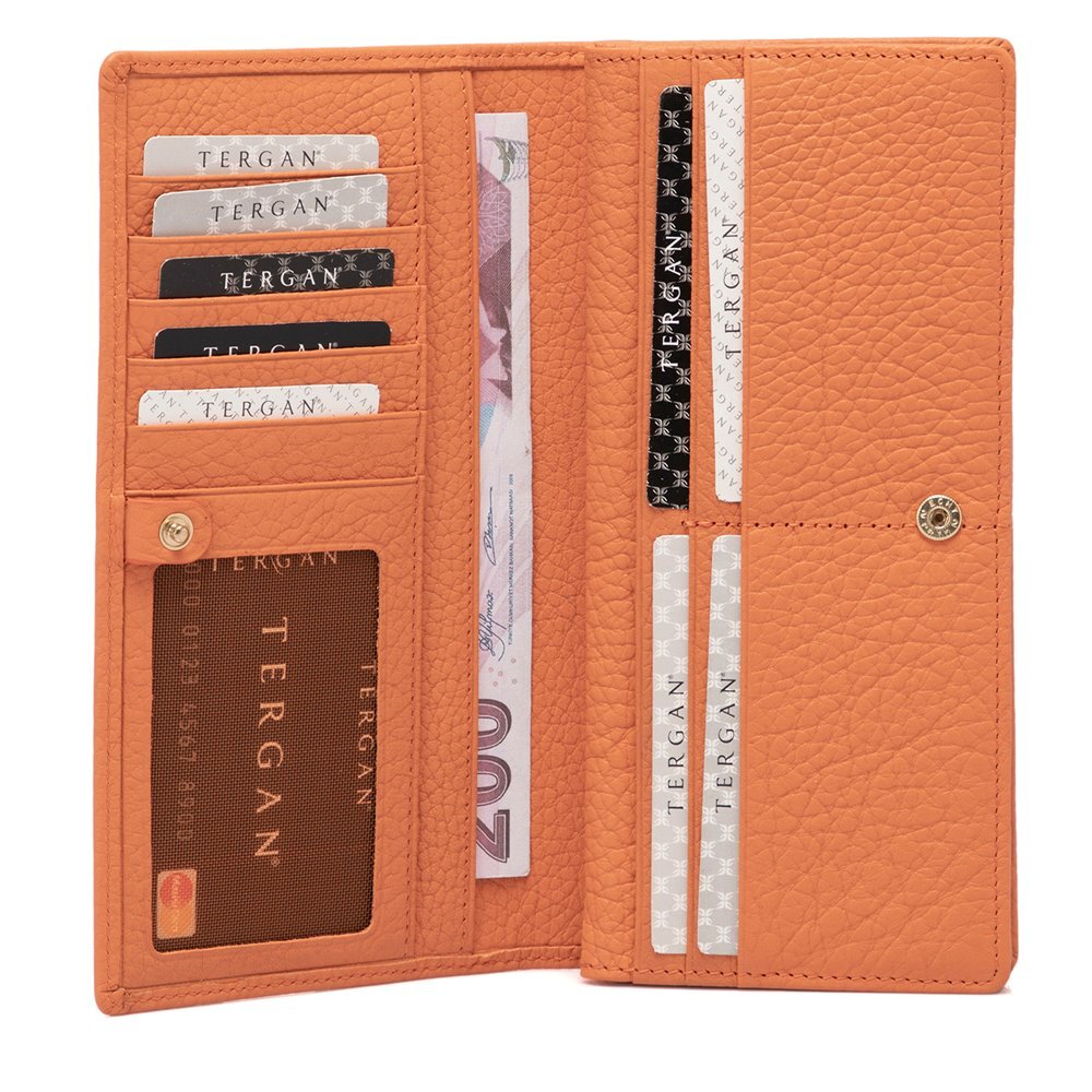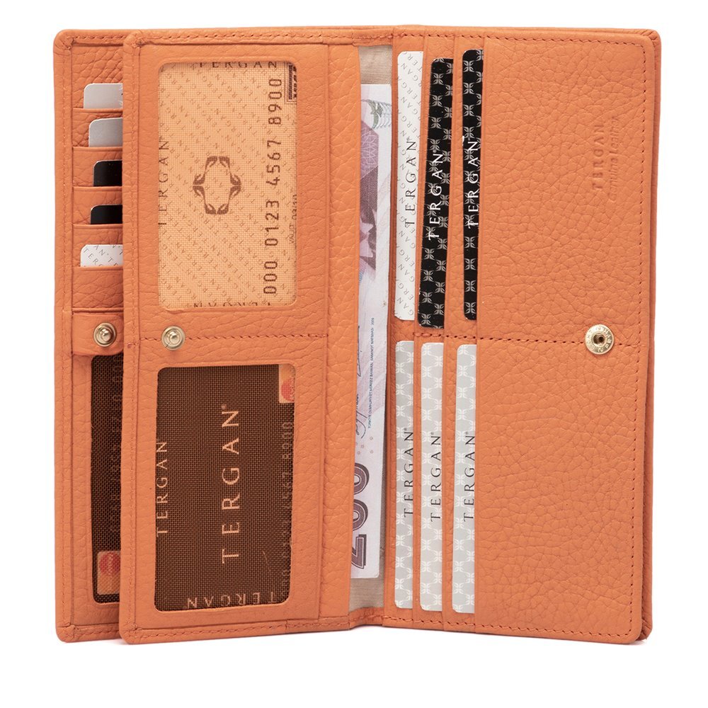 Tergan Kadın Deri Cüzdan gerçek deriden üretilmiştir. Kadın Deri Cüzdanın kapalı ölçüsü yükseklik 9,5 cm, genişlik 19 cm, derinlik 2,5 cm. Tergan kadın deri cüzdanın 18 adet kredi kart bölmesi, beş saklama alanı, şeffaf kimlik bölmeleri ve arka kısmında fermuarlı bozuk para bölmesi vardır. Kadın cüzdanın kapama şekli çıtçıtlıdır.